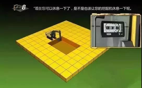 將發(fā)動機(jī)油門置于經(jīng)濟(jì)檔位置。選擇自動怠速功能,在停止挖掘時(shí)讓發(fā)動機(jī)怠速運(yùn)轉(zhuǎn)。