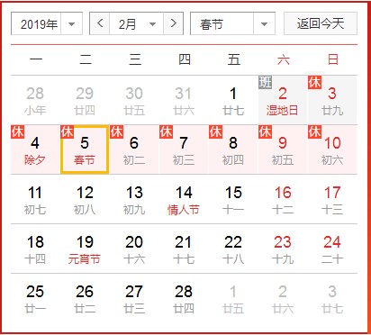 2019年2月3日至2月10日,2月11日(農(nóng)歷正月初七)上班,共8天。2019年2月2日調(diào)休上班。