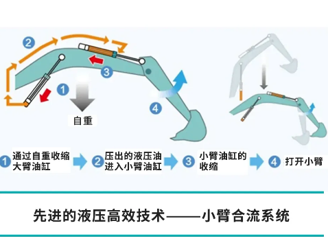 采用先進(jìn)的小臂合流系統(tǒng)及減少阻力的液壓回路,進(jìn)一步削減能耗,強(qiáng)力高效更省油。